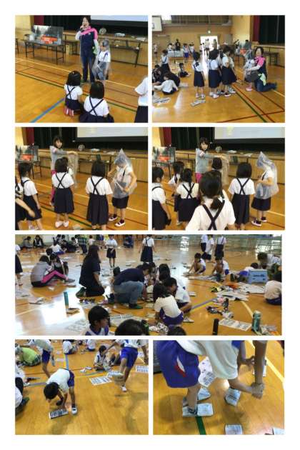 1〜4年生は、体育館で防災グッズ作りの体験をしました。新聞紙でコップやスリッパを作りました。区役所の方が親切に教えてくださったので、みんな上手にできました。うれしそうに自分で履いて見せてくれました!!