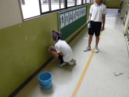 家庭科の学習で、校舎内の清掃を行いました。普段はあまり掃除をしないような細かい場所を、汚れに合った清掃用具(新聞紙・みかんの皮・歯ブラシ・お茶の葉など)を自分たちで選び、工夫してきれいにしました。