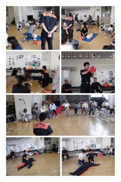 最初に署員の方のお話やDVDを見て、心臓マッサージや人工呼吸、AEDの使い方を学びました。そして、人形を使って、実施に心臓マッサージや人工呼吸、AEDの研修しました。