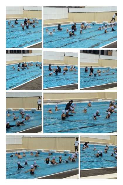 1年生にとっては、初めての大きな小学校のプールで、みんな、とても楽しみにしていました。気温、水温がまだ少し低く、子どもたちは、「地獄のシャワー」を歓声を上げて浴びていました!!