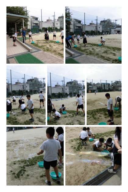 合成洗濯のりを水に溶かし、シロップやゼラチンを少し加えてシャボン玉液を作りました。うちわのほねや針金を丸くしたものを使って、シャボン玉をたくさん作ったり、大きなシャボン玉を作ったりしました。