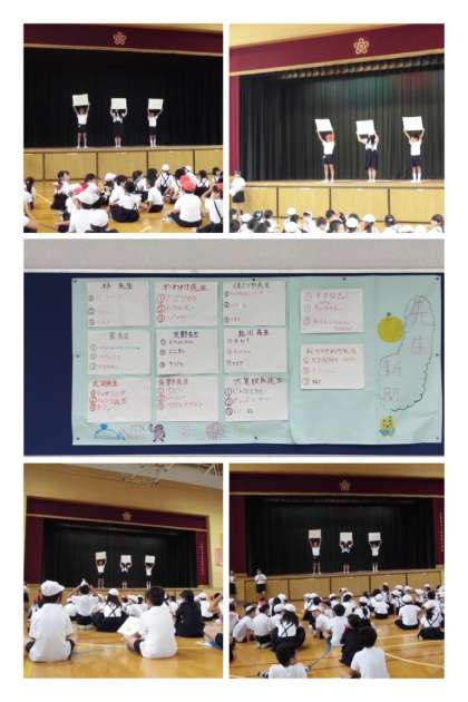 新聞委員会は毎月の活動でいつも楽しい壁新聞を作ってくれています。「◯◯先生を動物にたとえると」など先生方にインタビューして作った記事を三択クイズにしました。その答えは、赤白帽の色などで答えていました。