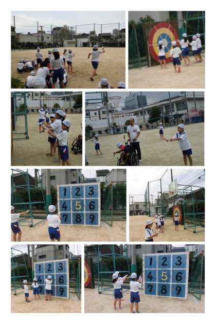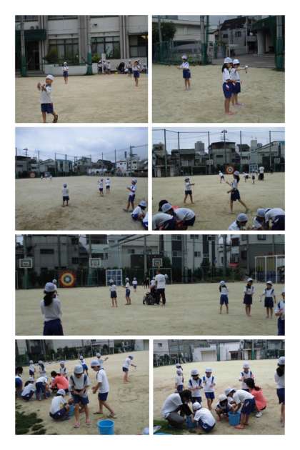 3時間目にプールに入るので、体操服の下には、水着を着て用意は万全です。お家から持ってきた洗剤やマヨネーズの容器に水を入れ、上に飛ばしたり、的をめがけて飛ばしたりしていました!!