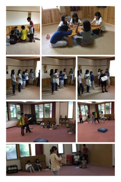 草原を転げまわって汗をかいたので、少し早めのお風呂タイムがありました。すっかりリラックスして部屋でくつろいだ後、明日のキャンプファイヤーのスタンツの練習をしました。