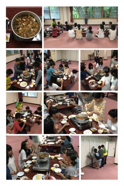 子どもたちが楽しみにしていた夕食です。クーラーのよく効いた食堂で鶏のすき焼きをいただきました。みんなで鍋を囲んで楽しそうに食べていました。