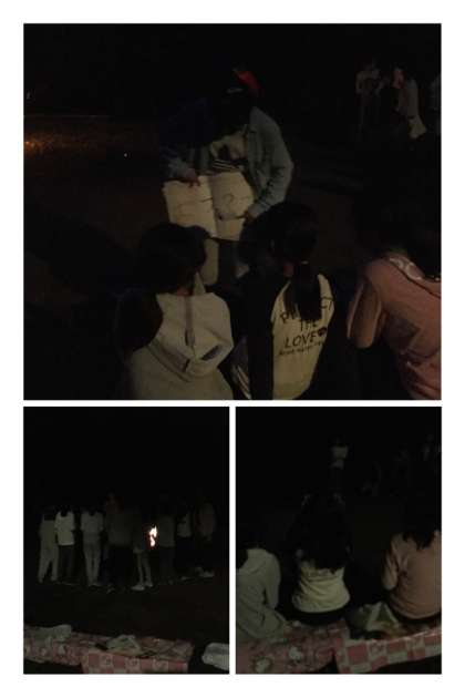 2つの行動班が、クイズや怖い話などのスタンツをしてくれました。途中から、麦わらのルフィの飛び入りがあり、大いに盛り上がっていました。暗くなってからの写真は心霊写真のようになってしまいました!!