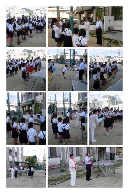子どもたち一人ひとりが書いたメッセージをラミネートとし、各学年の代表が一声かけてお渡ししました。日頃の見守り活動に対するお礼や感謝、運動会へのお誘いなど心を込めてお話ししていました。