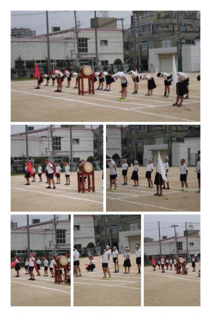 これまで体育館で練習してきた成果を見せようと大きな声を出しました。でも、運動場は広く、体育館のような反響は、返ってきません。登校して来た児童たちも、じっと見つめているので、少し緊張もしている様です。