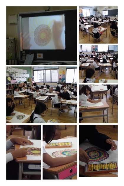 最初に先生が書画カメラを使って手本を示し、子どもたちが描き始めました。いろんな色の点を組み合わせて花の中心部を描き、続けて花びらを描きました。