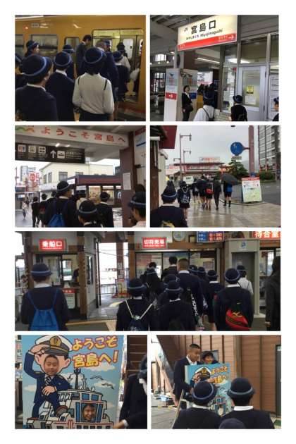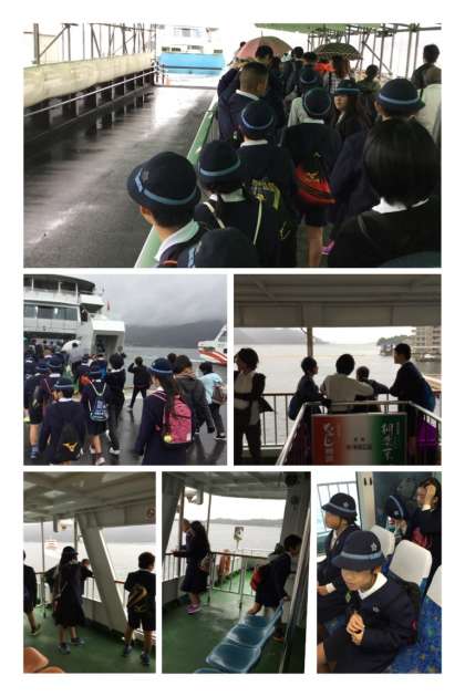 電車から松大汽船に乗り換えて、宮島に向かっています。厳島神社の赤い鳥居が見えてきました!!