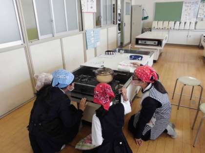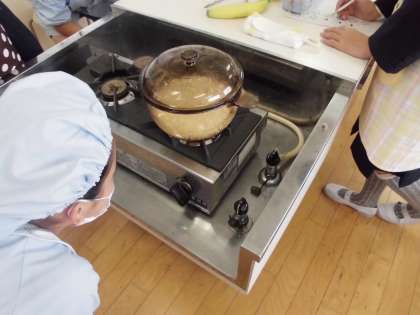 透明のお鍋なので、水が沸騰してお米が炊けていく様子がよく分かります。毎日食べているご飯がどんな風にできていくのか興味津々!炊飯器とは違って、おこげもできました。この後すぐに給食のご飯を食べるので、味の違いも感じ取れたらいいですね。