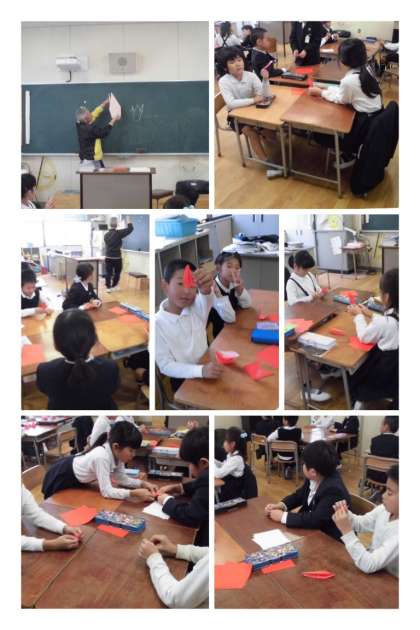 先生が前で大きな紙で見本を見せ、子どもたちは、一折りごと真似ていきました。中には、初めて自分で折れたと喜ぶ児童もいました!!