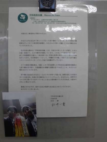 これは、広島市長さんが会長を務められている「平和首長会議」の取組の一つで、「原爆の子の像」に捧げられた折り鶴をヒロシマからのメッセージとして世界へ届ける活動をされているそうです。そして、11月1日に本校の子どもたちの祈りがこもった千羽鶴が、シカゴでオバマ財団の関係者の方に手渡されたそうです!!