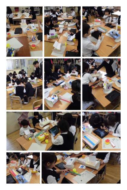 最初に先生が見本となる仕組みを組み立てました。子どもたちに縦に揺れるか、横に揺れるかを予想させました。興味を持った子どもたちは、イメージをふくらませて、動きを試しながら装飾を考えておもちゃを作りました。
