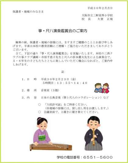 本校三西クラブ「ハーモニーお箏クラブ」講師の先生方による演奏会を5・6年生が鑑賞します。保護者、地域のみなさんもぜひご鑑賞ください。<(_ _)>