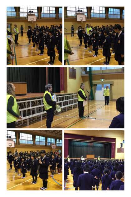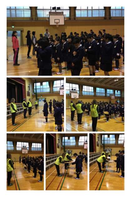 3月5日(月)、今日の児童朝会で「見守り隊感謝の集い」を行いました。雨天のため、予定を変更して体育館で行いました。