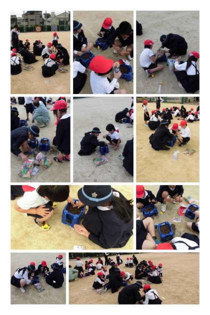 5月10日(木)、1年生が6年生と一緒にアサガオの種を蒔いていました。