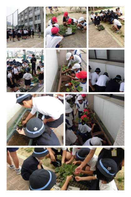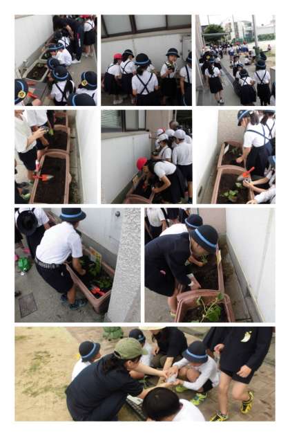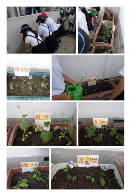各学年が、琉球朝顔・ゴーヤ・ひょうたん・ヘチマなどつる性の植物を植え、緑のカーテンを作りました。夏までにはどんどん成長し、校舎の2階3階まで伸びて、立派な緑のカーテンができることでしょう!!