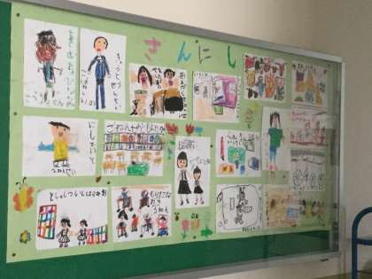 5月23日(水)、1年生の掲示板に三西小を紹介したイラストマップ?が掲示されていました。
