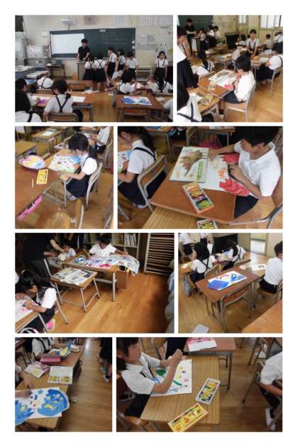 色とりどりの大きな卵かを自分で想像した絵を描いていました。卵は別にクレヨンで描いて、それを画用紙に貼り、立体的にしていました。