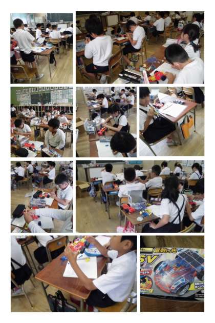 6月15日(金)、4年生が理科の授業でモーターを使った車を作っていました。モーターからのびた電線のビニールを少し外して電池ボックスの両側につけ、回転を確認していました。また、電線をつける位置を逆にして回転する方向を 確認していました。