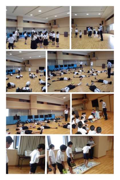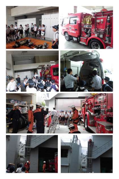 消防署では、オフィスや仮眠室などいろいろな場所を案内してくださいました。署内の体育館では、地震時と避難の仕方や寝床の近くに靴を置くなどの備えの大切さを体験させてくださいました。また、消防車や救急車の見学やはしごを使った訓練も見せてくださいました!!