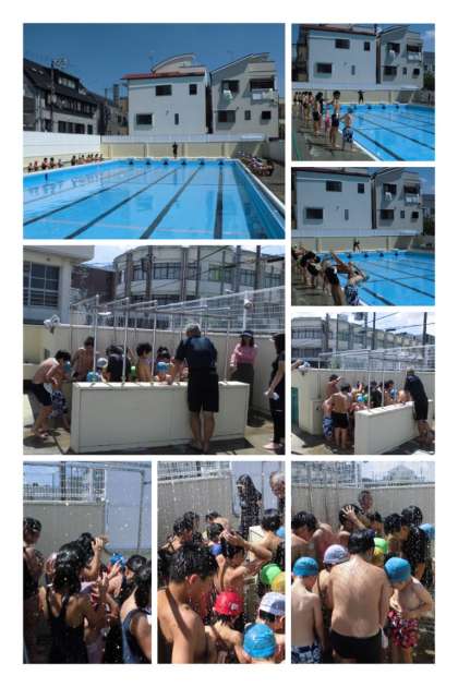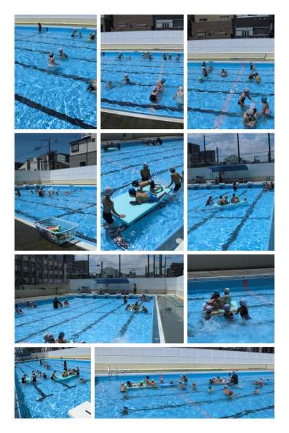 幼小の子どもたちがペアやトリオを作り、準備体操やシャワー浴びから一緒に行動しました。園児のみなさんは大きいプールを怖がる事なく元気にプールに入っていました。5年生が泳ぎの手本を見せたり、潜って宝探しをしたり、最後は島を浮かべて遊びました!!