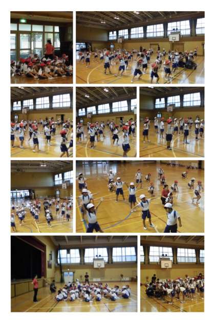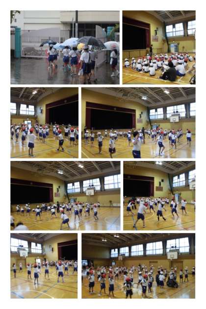 9月10日(月)、朝からの雨のため1・2年生が体育館で運動会の練習をしていました。傘をさして体育館に移動し、先生の説明を聞いていました。学年演技のダンスもしっかりと覚えていて、要領よく練習をしていました!!