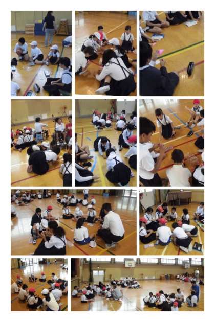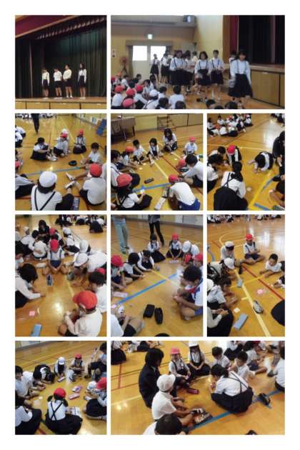 10月4日(木)、今日の児童集会で、6年生が全児童に向かい折り鶴づくりを呼びかけました。これは、6年生が修学旅行で広島の平和記念公園を訪れ、平和を願って献げる千羽鶴を作るためのものです。子どもたちは、一人ひとりが折り紙の裏にメッセージを書き、6年生に折り方を習い折りあげていました。折れない下級生の分は、6年生が仕上げます!!