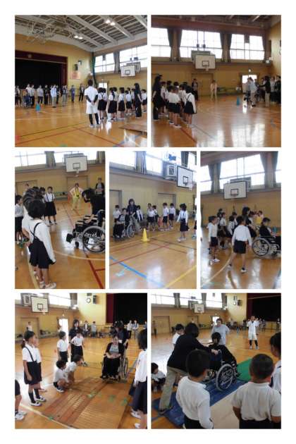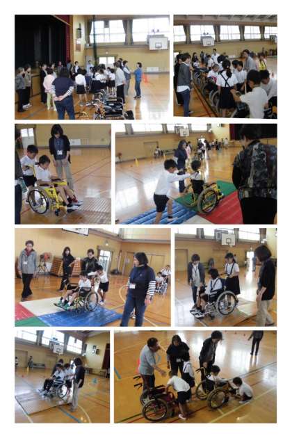 最初に体育館でごあいさつをし、正しい車いすの使い方の手本を見せていただきました。そして、子どもたちも二人一組になり、車いすを押し始めました。跳び箱の踏切板やマットでつくった障害物を苦労しながら押しました。体育館から外に少し出るだけでも大変でした。