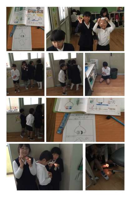 豆電球についた導線を電池のプラス極とマイナス極につなげば、当然、豆電球が光を放ちます。でも、子どもたちはそれがうれしくてたまりません。先生に教室の照明を消してもらい、机の下や清掃用具箱に入って、「きれい」「きれい」の大騒ぎ!!