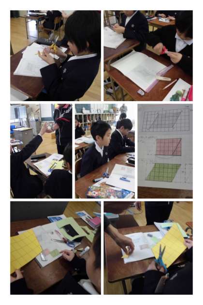 いろいろな図形の面積を求める単元で、この時間は平行四辺形の面積の求め方を学習しました。まだ、正方形と長方形の面積を求める公式しか習っていないので、マス目の入った紙に書かれた平行四辺形をハサミで切り、長方形を作ってその求め方を学習しました。いろいろな考え方をみんなでみつけ、発表し合いました!!