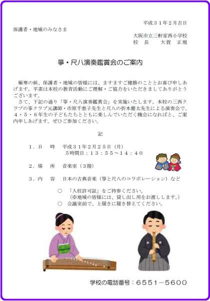本校三西クラブ「ハーモニーお箏クラブ」の元講師の先生方による演奏会を4・5・6年生が鑑賞します。保護者、地域のみなさんもぜひご一緒に鑑賞してください。<(_ _)>