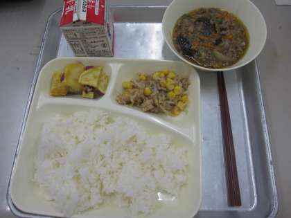 本日の給食は、ごはん、牛乳、マーボーなす、ツナと野菜のいためもの、そして焼きさつまいもの甘みつかけでした。ごはんと牛乳で基本の栄養を整え、マーボーなすで野菜とたんぱく質をしっかりと、ツナと野菜のいためもので彩りとビタミンを加えています。最後の焼きさつまいもの甘みつかけは、秋らしい自然の甘みが楽しめる一品です。