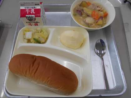 本日の給食は、黒糖パン・牛乳・鶏肉とさつまいものシチュー・はくさいのピクルス・りんごでした。