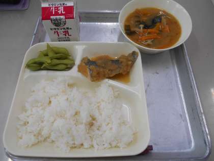 本日の給食は、ごはん、牛乳、さごしのみぞれかけ、かぼちゃのみそ汁、えだまめでした。