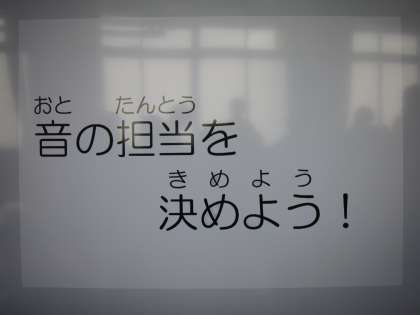 音楽室にある楽器を使って、状況にあった音を表現しました。