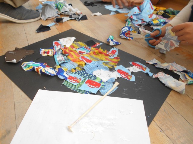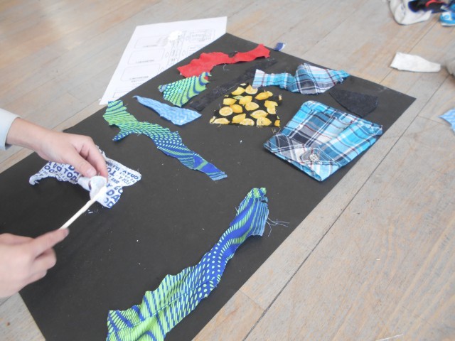 黒い画用紙の上に、子どもたちは布をちぎったり、組み合わせたりしながら、物語のような絵を表現していました。