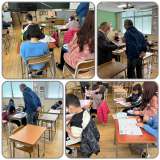作品展に招待してもらった,1年生が,三軒家西幼稚園のまつ組さんにお礼の気持ちを伝...