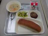 焼きハンバーグ 豆乳スープ キャベツとピーマンのカレーソテー 黒糖パン 牛乳