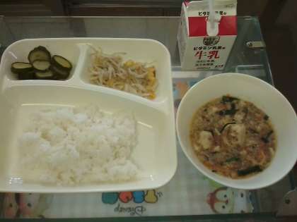 ごはん、牛乳、マーボーどうふ、きゅうりの甘酢づけ、もやしとコーンのごまいため