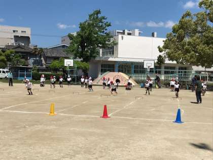 5月7日(火)2時間目、1年生が運動場で体育をしていました。リレーをしていますが、ぐにゃぐにゃのラインを走り、障害物を越えていました。