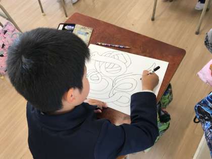 5月8日(水)3年2組は図画工作で絵を描いていました。子ども達はへびを描いているようでした。複雑に入り組んだ形に色を塗っていくようです。完成が楽しみです。