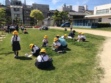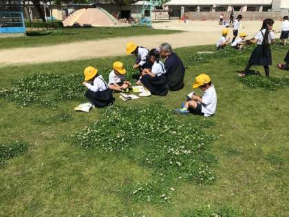 5月8日(水)5時間目、抜けるような青空のもと1年生が芝生にいました。よく見ると芝生に生えてきたしろつめくさをつんで、指輪やかんむりを作って遊んでいました。
