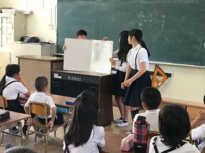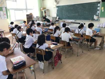5月16日(木)朝の読書で、真剣に本に向かっていました。また、図書委員会が大型絵本で読み聞かせにまわっていました。