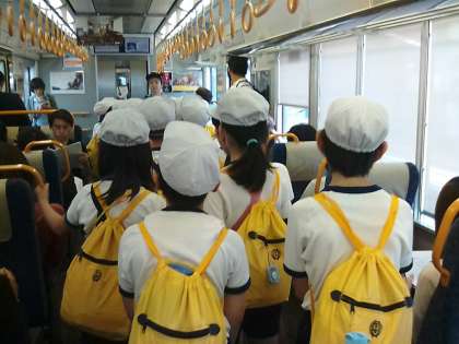 5月17日(金)3・4年は遠足で長居公園に行きます。電車内でお行儀よく乗っています。