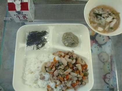 ごはん、牛乳、かやくご飯、みそ汁、まっ茶ういろう