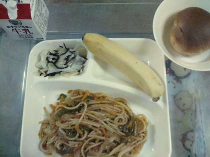 パン、牛乳、カレースパゲッティ、キャベツのひじきドレッシング、バナナ