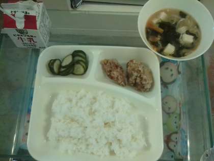 ごはん、牛乳、豚肉の香味あげ、みそ汁、きゅうりの甘酢づけ