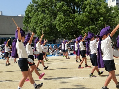 4年生定番のエイサーの演技。リズムの一体感が、心を打ちました。
